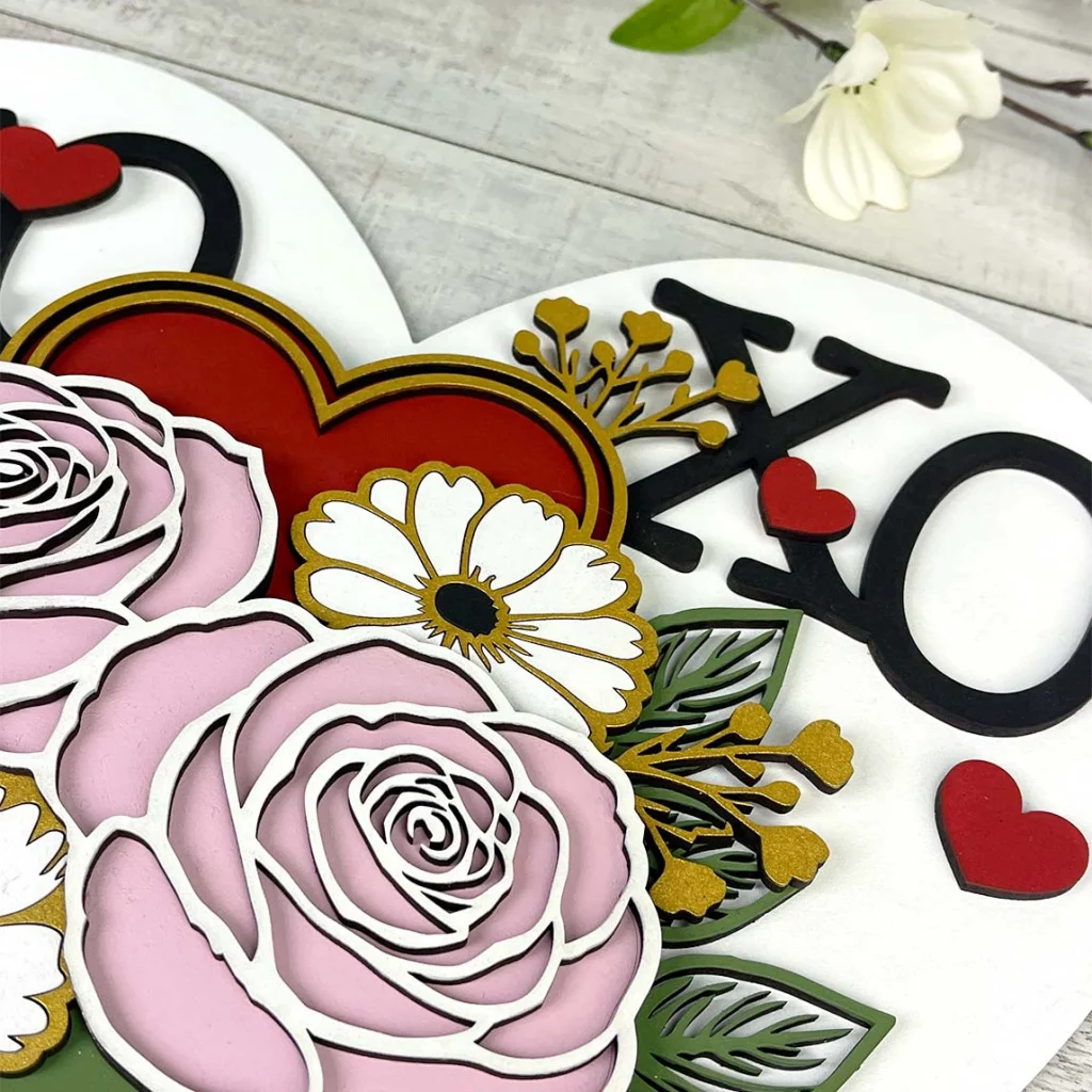 This laser-cut XOXO Floral Heart sign is designed as a Valentine’s Day décor piece that balances detail with ease of assembly. The finished sign features a classic heart shape, bold lettering, and a soft floral bouquet that adds depth and visual interest without being overwhelming.